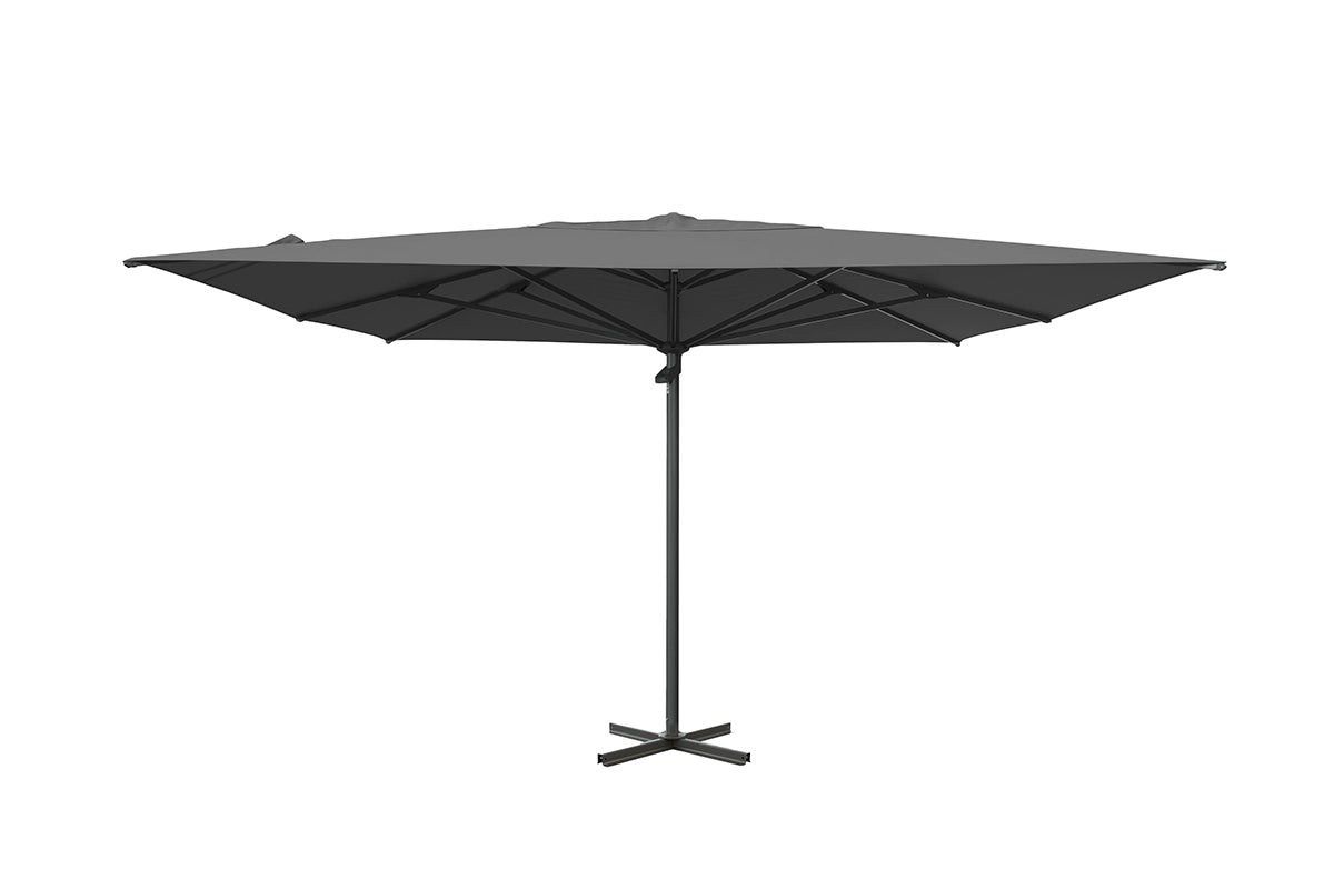 Ce grand parasol carré (4x4 m) dispose d'une ouverture de ventilation et d'une toile en polyester teint dans la masse de 300 grammes avec un revêtement déperlant. Le parasol nécessite un ancrage, et une base en croix avec boulons est incluse (poids vendus séparément).
